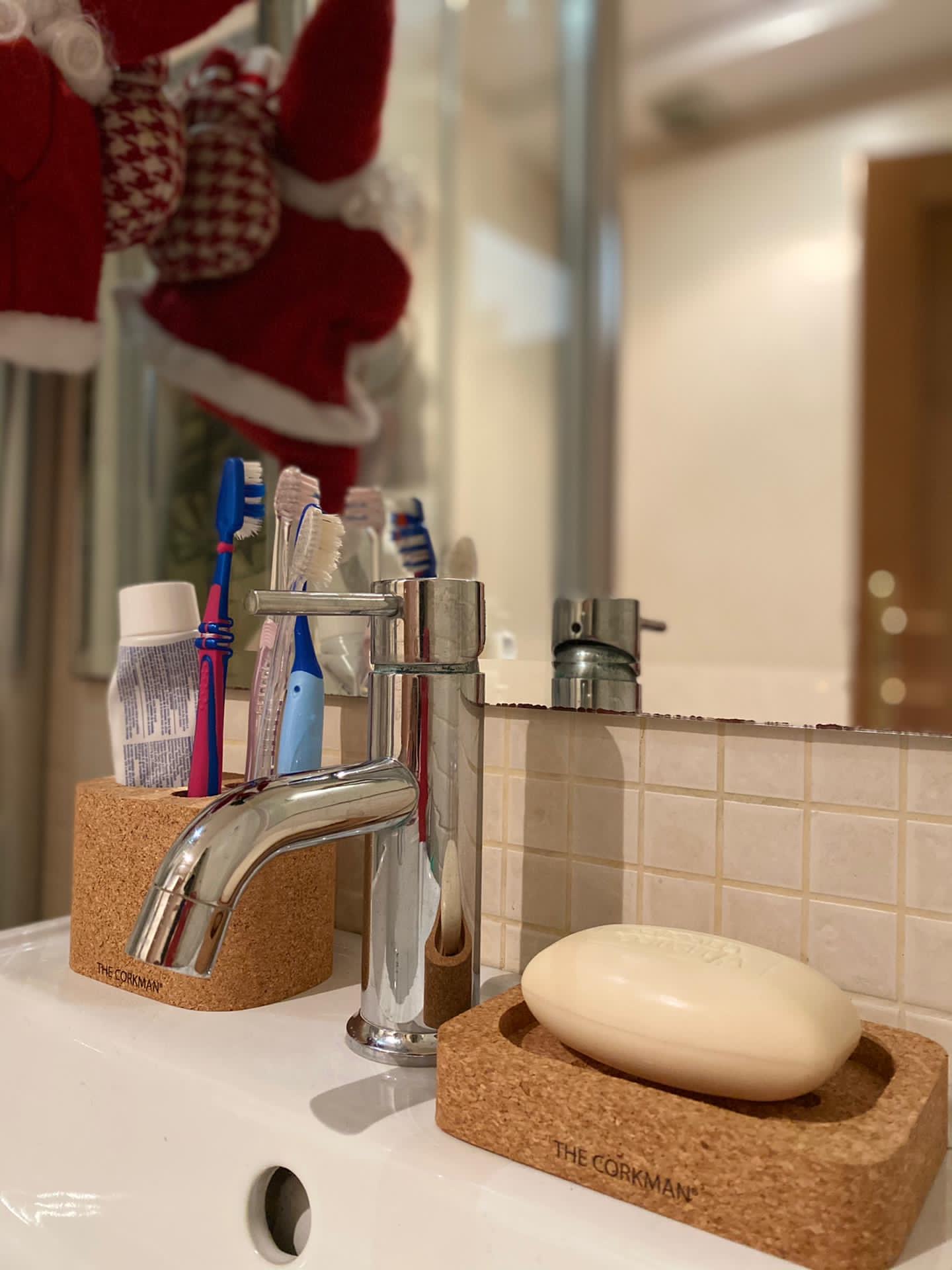 Conjunto de WC , composto por uma saboneteira e um porta escovas em cortiça impermeável.