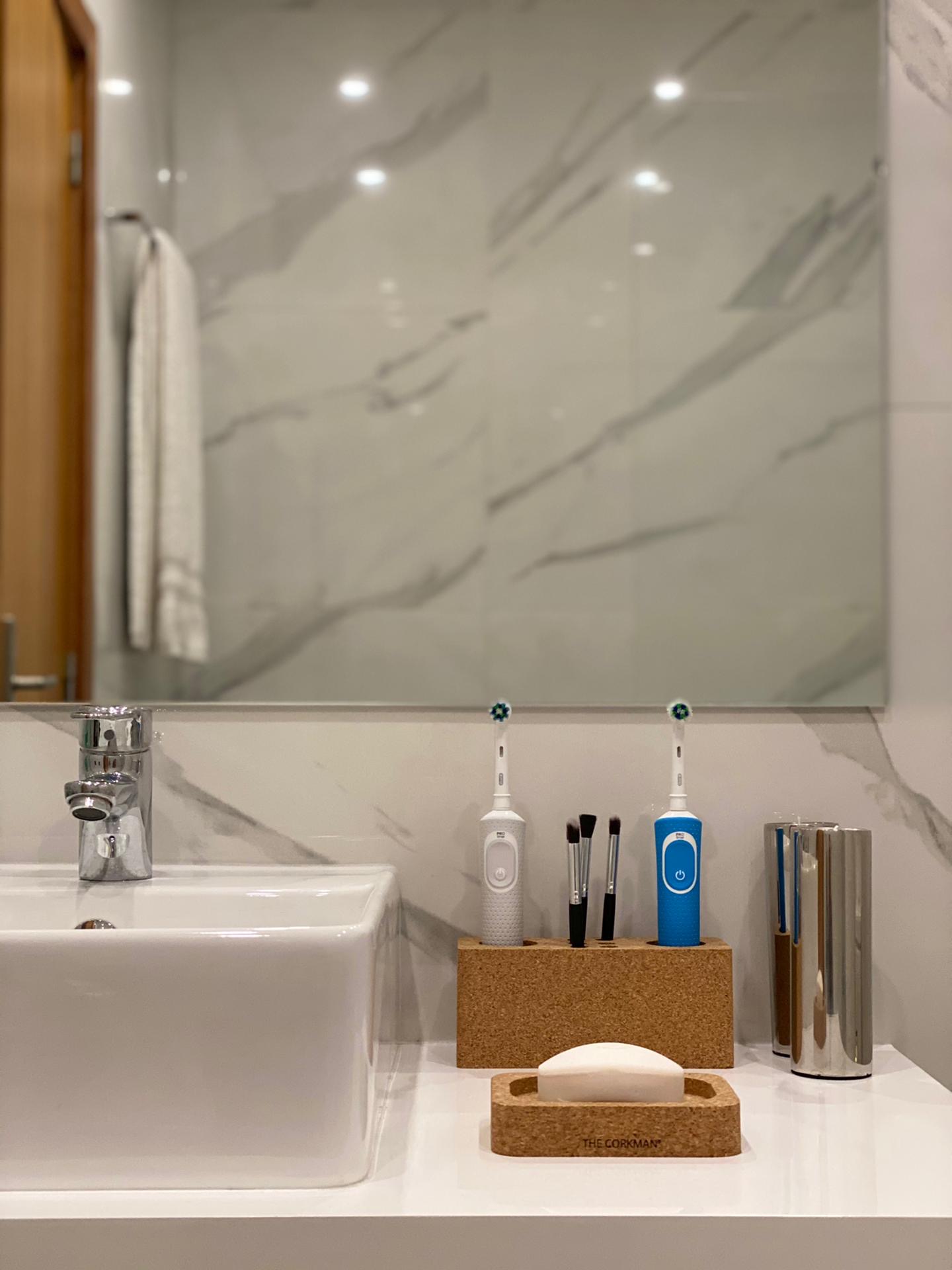 Conjunto Wc em cortiça , composto por uma saboneteira e porta escovas em cortiça.