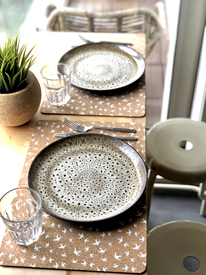 Conjunto de 6 individuais retangulares em Cortiça decorada com andorinhas.